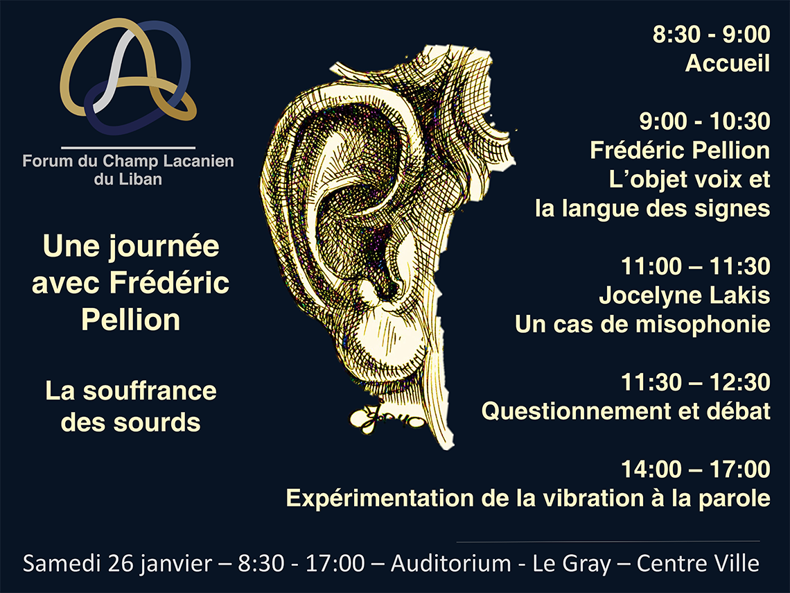 Le Forum du Champ Lacanien du Liban reçoit Frédéric Pellion qui parlera du problème de la surdité, et particulièrement de l’objet voix.