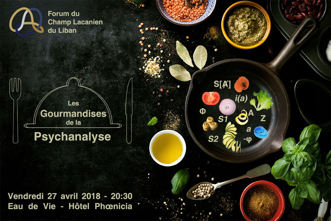 Le dîner intitulé « Les Gourmandises de la Psychanalyse » eut lieu le vendredi 27 avril 2018 à l’Eau de Vie de l’hôtel Phoenicia de Beyrouth. Il ouvrit le weekend du FCLL « Le Signifiant sur les Ailes du Phénix. » Furent servis la privation, le désir, l’objet a, le sujet divisé, le Che Vuoi, l’IF… dans des plats onctueux, chauds, glacés, soupe, desserts… bref une extase psychanalytique dans un plat ! Pour une fois, le corps fut joui à travers une expérience Autre, un voyage gastronomique où l’algèbre lacanienne, le concept, prirent consistance, faisant de l’expérience un moment initiatique de dégustation ainsi que de psychanalyse.