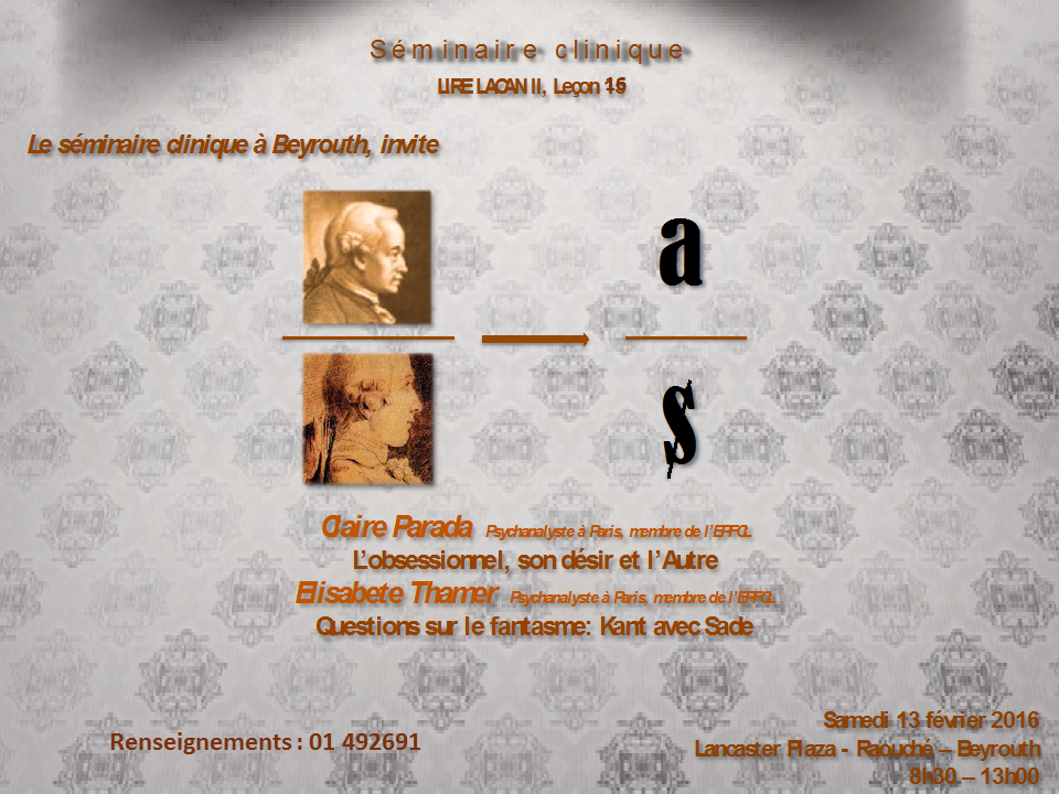 L’Obsessionnel, son Désir et l’Autre – Questions sur le Fantasme : Kant avec Sade 13 février 2016 L’Obsessionnel, son Désir et l’Autre Questions sur le Fantasme : Kant avec Sade Claire Parada et Elisabete Thamer Facebook Twitter LinkedIn Share on WhatsApp Pinterest