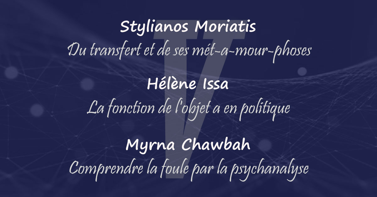Dans cette réunion du séminaire d’enseignement Pour que vive la parole et demeurent les liens, en accordance avec le thème de travail pour l’année 2020, le Forum du Champ Lacanien du Liban a le plaisir de recevoir, ce lundi, le 24 Février, Stylianos Moriatis, membre du Forum d’Athènes, qui présentera, Le transfert et ses mét-a-mour-phoses. Hélène Issa, de son côté, continuera à développer La fonction de l’objet a en politique, et Myrna Chawbah entamera la seconde partie de son travail, Comprendre la foule par la psychanalyse. Ceci en temps réel sur Zoom, un outil du virtuel, de 20h jusqu’à 22h 30.